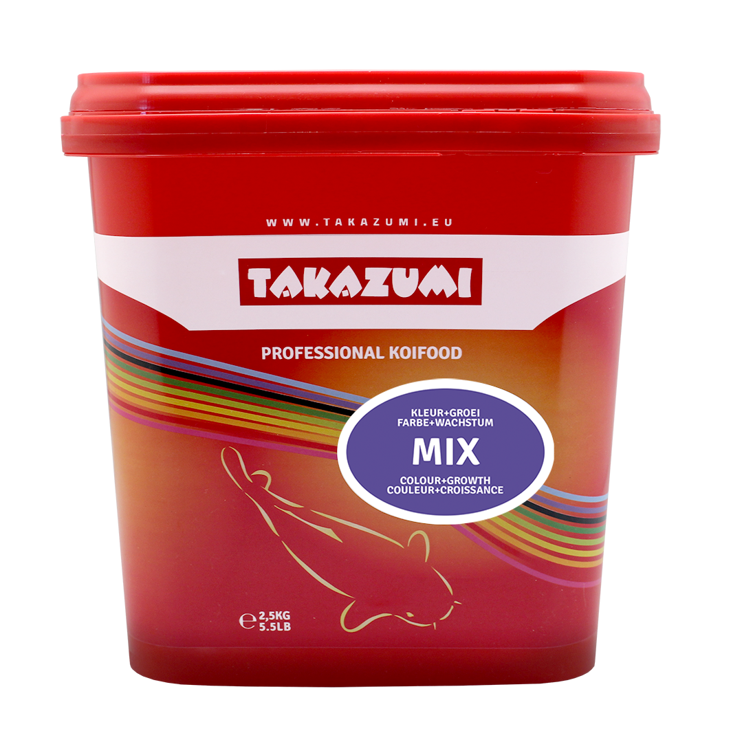 Takazumi Mix is een uitgebalanceerd professioneel combinatievoeder met een medium vet- en medium eiwitgehalte en alle voedingsstoffen voor een gezond koi leven, een optimale, snelle groei en een intense kleurontwikkeling van uw Koi. Zorgvuldig geselecteerde grondstoffen staan borg voor een kwalitatief hoogwaardige voeding die het water niet vertroebelt. Door de combinatie van twee topvoeders (Gold Plus en High Growth) zal de Koi een goed kleurontwikkeling doormaken en optimaal groeien.